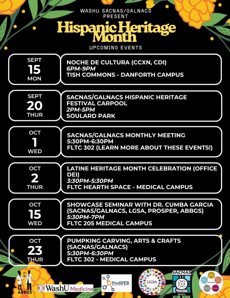 SACNAS/GALNACS Monthly meeting Oct 01, 2025 5:30 p.m.-6:30 p.m. DBBS Sponsored Event Farrell Teaching and Learning Center, Room 301 Add to: Google Calendar | Outlook | iCal File Learn more about SACNAS and GALNACS and Hispanic Heritage Month at the Monthly meeting. 5:30 pm-6:30 pm FLTC 302