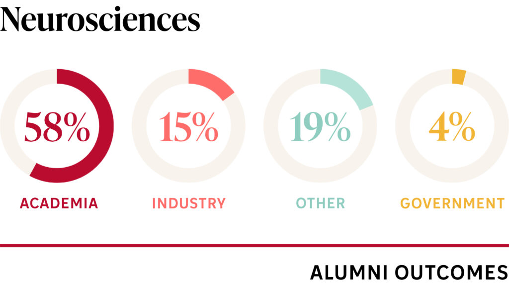 Neurosciences graduates pursue a variety of careers. Most program graduates go into academia, but many find paths in industry, government, and other fields, like science communication, law, and business and entrepreneurship.